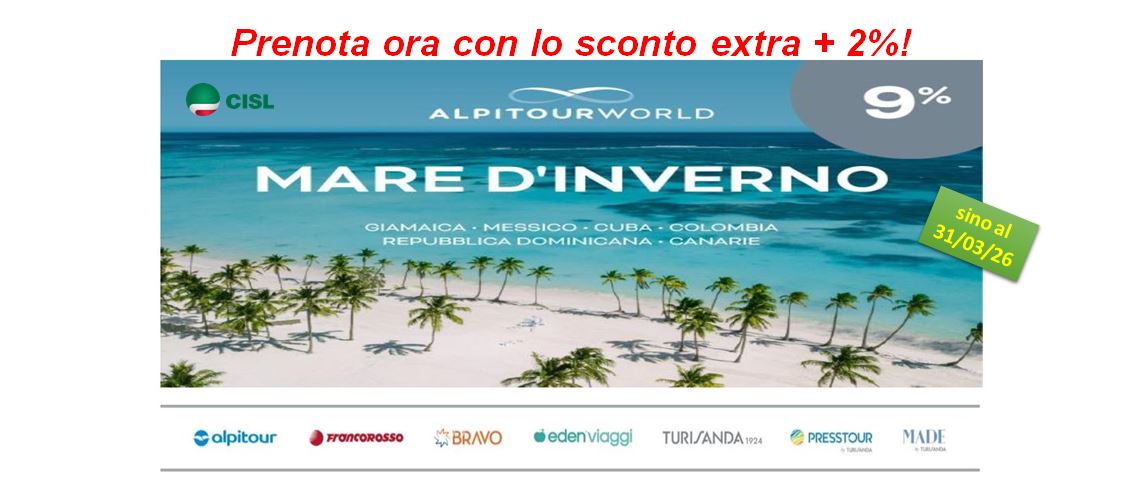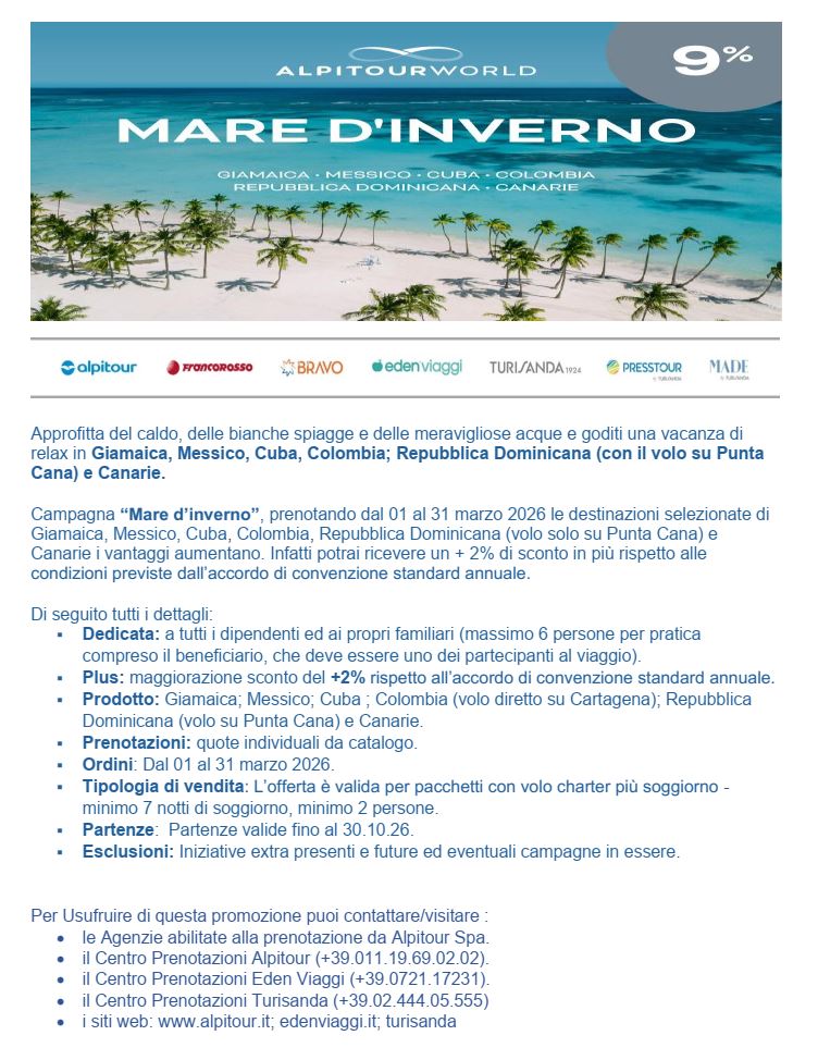 Sino al 31MARZO 2026 è attiva la promozione speciale "MARE D'INVERNO" della nostra convenzionata Alpitour, che prevede uno SCONTO EXTRA DEL 2% che si somma a quello previsto dalla nostra convenzione, per chi prenota ENTRO il 31/03 un soggiorno di minimo 7 notti (con volo charter) per 2 persone presso le strutture del Gruppo Alpitour in GIAMAICA, MESSICO, CUBA, COLOMBIA, REPUBBLICA DOMINICANA e CANARIE.