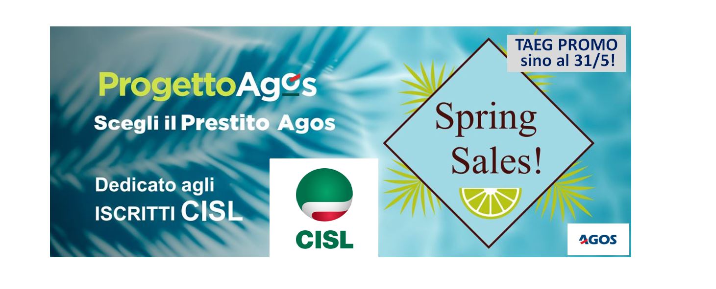 AGOS ha predisposto una nuova offerta "primaverile" riservata agli iscritti CISL, valida sino al 31 Maggio 2026: se hai necessità di un prestito, è possibile richiedere sino a € 4.500, rimborsabili in 24 rate da € 201,30 (TAN 6,92% - TAEG 7,14%).